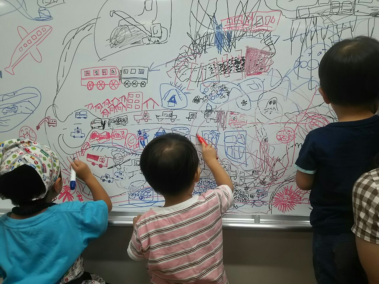 会場は料理室なので、調理テーブル以外の空間はあまりないのですが、敷物を敷いて絵本も数冊用意されていたので、ねんねの子や絵本読む/聞く子はそこで過ごしたり、ホワイトボードでお絵かきしたりして遊べましたよ。